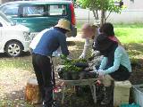 いよいよ作業開始です。炎天下のため、作業は木陰になりました。卒業生も参加して、移植作業を協力してくれました。作業内容は、育苗箱の苗をビニポットに移植するものです。肥料を混ぜた土は、私が準備しました。保護者の方は仲良しグループでしたから、世間話に花が咲いていました。