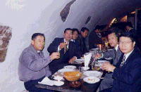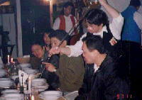 | お昼は「ファームレストラン」に到着。畑の真ん中にぽつんとありました。長ーいガラスビンで゜ワインを注いでくれます。一滴もこぼさないのが、プロなのでしょう。料理はどこに行っても脂っこいものが多く、スープとワインと硬いパンは定番です。 | ||||