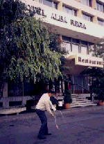 ホテルの前でちょんかけごまをしているのは私です。答礼懇親会の出し物になっていますので、早朝練習です。道行く人が不思議な顔で見ていました。 右は私の部屋から眺めた町のようすです。大きな街ではありません。酔っ払いが多く、夜中まで騒いでいる人もみかけました。 |