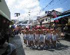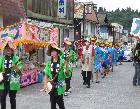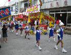 祭りは前日から行われるわけですが、やはり主なイベントは日曜日になります。左の写真は、11時からの仮装パレードです。保育園の保護者による仮装行列です。500mほどの商店街を練り歩きます。午後12時半からは、小学校5校による鼓笛パレードになりました。小学校の先生や保護者も後を付いています。よく見たら、なつかしい校長先生がいました。