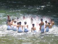 若者に担がれたまま、みこしは五ヶ瀬川の中に運ばれました。ここからが祭のクライマックスで、ワッショイ・ワッショイの掛け声でみこしは持ち上げられ、お地蔵さんを載せたまま川の中に落とされます。この動作が数回でなく、何十回も繰り返されます。しばらくしたら担いで川の中を回りますし、見ている方が疲れます。