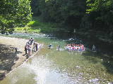 裸みこしを撮影しようと、橋の上からも河原からも盛んにカメラが向けられます。私自身もすばらしい祭に出会い、デジカメで数十回撮影したのです。今まで見てきた地蔵祭はお参りすることが中心でしたが、ここでの祭は躍動感あふれるものでした。初めての体験に感動を覚え、さわやかな気分で馬見原を去りました。