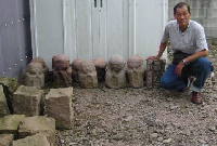右の写真は、コミュニティハウスの裏の空き地です。切り出されたままの石材と、制作途中の地蔵がたくさんありました。足元の小石は、馬門石の破片です。