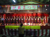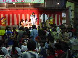 六時にお寺からお坊さんがやってきて、読経が行われます。祭りに来た人はまずお参りをして、ステージ前のパイプ椅子に座ります。6時過ぎ、いよいよステージでの催し物になります。ステージは写真ではわかりませんが、大型トラックを利用したものです。