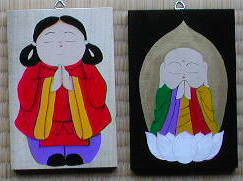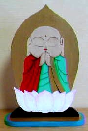横20cm、高さ30cmの両手合掌の地蔵菩薩です。板に図案を転写して、糸鋸で切り出しました。舟型光背には金の絵の具で塗りました。冬休みに入り作りましたので、完成は平成14年1月2日になりました。
