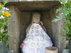 | 「セキソの地蔵」と呼ばれており、石造りの祠の中に祀られています。祠の前面に「文化十酉(1813)年8月吉日」 「茶屋嘉左衛門」と刻まれています。祭日は旧暦6月21日で、宮園地区の錫木家が祭を営みます。セキソの地蔵は、子どもの熱病、耳の病気を治してくださるそうで、胸当て作って地蔵さんに掛け、おまいりしたあと、胸掛けを帰り、病気の子どもに掛けてやると霊験あらかたといわれています。 |