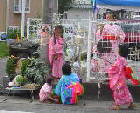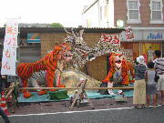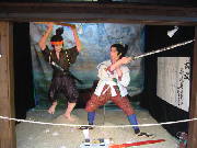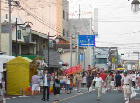 本町通りにやってくると、大きな造り物が目に入ります。材料は何でもありの造り物ですが、商店街の人が時間をかけて造っています。左の写真は、虎と竜を題材とした「竜虎」です。右の写真は、宮本武蔵と佐々木小次郎の戦いを描いた「巌流島の闘い」。造り物は世相を反映し、ボブサップや招きトラもありました。そして、数多くの露店が並び、おいしそうな香りも漂っていました。