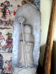 (石仏) 右手には錫杖を持ち、左手に宝珠を持っています。地蔵菩薩の立像で、作りは普通です。指先が欠けています。写真でもわかるように、左側頭部がはく離しています。光背の一部もはく離していました。享保8年(1723年)の9月に造られたものです。