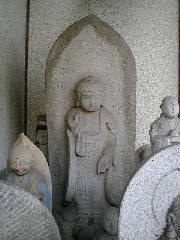 (石仏) 頭髪がありますので、地蔵菩薩ではありません。右手が施無畏印、左手が与願印の釈迦如来のようです。私の持っている別の資料には阿弥陀如来であるとも書かれています。その根拠は左手の親指と人差し指で輪を作っているからというものです。輪を作っていれば、九品来迎印(阿弥陀如来特有の印)の中の、上品下生の印になります。実際に見ましたが、指が折れていて判断がつきません。
