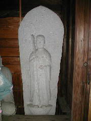 (石仏) かなり大きい感じの地蔵菩薩の立像です。左手に宝珠を持ち、右手には幡(はた)を持っています。幡を持っている地蔵は、この20体だけです。幡というのは、菩薩の威徳を示すためのかざりの道具です。さおの先に三角形の金具があり、そこに細長い布を下げます。バンともいいます。地蔵立像としては、最大のものです。