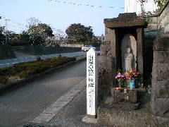 (場所) 菊池郡泗水町北田島天満宮前の三叉路にあります。熊本市清水町から西合志町に入り、上須屋のニコニコ堂から県道37号線をひたすら北上します。やがて泗水町北田島に着きますので、県道右側に注意してください。登り坂の右手に天満宮があり、そのそばに白い標木と地蔵が見えます。民家石垣の一角に、第40体Aが安置されています。