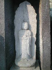 (石仏) 光背の角がかなりでこぼこになっている、地蔵菩薩です。両手に宝珠を持っている、やや大きめの地蔵立像です。傷みがはげしく、顔はつぶれています。何度も前方に倒れたのかもしれません。この石仏は、享保13年(1728)に建立されたもので、この年最初の製作です。