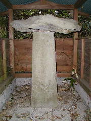 (測定) 台石の高さは、102cmあります。台石は正四角柱でなく、底辺部が広くなった錐体です。上の部分は縦横ともに27cm、底辺部は縦横ともに36cmあります。笠石は横幅94cm、奥行き88cm、厚さ14cmほどの自然石です。台石底辺から測定した全体の高さは116cmでしたが、笠石がデコボコですから正確ではありません。