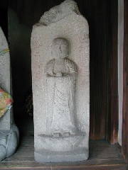 (石仏) 光背の左側の上部がこわれ、なくなっています。それほど大きくはない、地蔵菩薩の立像です。両手に宝珠を持っています。いくつも地蔵がありますが、手前の右側に安置されています。この石仏は、享保13年(1728)に建立されたものです。