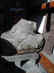 (石仏) 昭和20年8月8日の空襲で破壊されました。かろうじて蓮華座と足元だけが残っています。光背はもちろん、台石もありません。この石仏は、享保13年(1728)に建立されたものです。