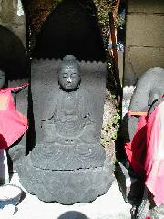 (場所) 熊本市春日2丁目の音羽屋と熊本ファミリー銀行の路地から入って200mほど直進します。突き当たりがT字型の三叉路になっていて、大きめの堂があります。いくつもありますが、中央の地蔵が、48体目です。高さ1m程度の阿弥陀如来座像です。左に58体目があります。保存もよく、傷んでいません。