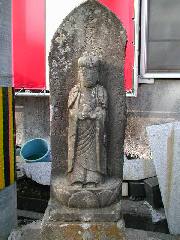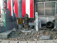 (場所) 菊池郡西合志町野々島です。矢具神社の石垣の右角です。両手に宝珠を持つ地蔵立像です。平成11年10月2日に撮影に出かけました。矢具神社の大きな杉が、台風18号のため倒されていました。この地蔵がある所は交差点になります。その後平成13年11月25日に再度訪問しましたら、工事のために石仏が移動していました。現在安置されている場所は、交差点の角に石材店がありますが、そのお店の前です。工事が完了すれば、元の場所に安置されるかと思います。