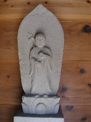 (石仏) この石仏は、享保14年(1729)に建立されたものです。左手に宝珠を持ち、右手に錫杖を持っている地蔵菩薩の立像です。石は安山岩ではなく、砂岩のように思います。光背の縁に沿ってできたひび割れや、表面の色とざらつきからそのように判断しました。この石仏の特徴は蓮華座にあります。写真でもわかるようにハスの花びらが二重になっています。これを複弁といいます。この石仏だけが複弁であり、他にはありません。