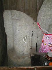 (場所) 玉名郡玉東町原倉本村の地蔵堂にあります。県道沿いで、左に直進すれば植木町に下る場所になります。Y字形の交叉点で、角に清田酒屋があります。玉東町唯一の放牛地蔵です。堂には二つの地蔵が並んでいますが、左の欠けている地蔵です。地元では「身代わり地蔵」として大切に扱われています。佐々友房や兵士の命を救ったからだそうです。