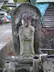 (石仏) 光背の上は壊れていて、頭から上はセメントで補修してあります。両手に宝珠を持つ地蔵立像になっています。堂はなく、野ざらしの状態です。この石仏は、享保16年(1731)に建立されたものです。