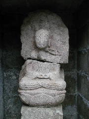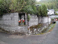 (場所) この石仏は、熊本市池上町2045にあります。熊本駅から西に向かって進み、高橋町の最初の橋(坪井川と井芹川合流点)を渡ったら、すぐに右折します。左手には神社があり、井芹川に沿って200mほど細い道を上流に進みます。そこでY字形交叉点に出ますので、その道を左へ降りて500mほど村の中を直進します。松岡さん宅のブロック塀の角にあります。