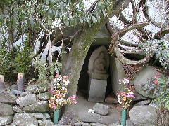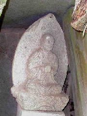 (石仏) 石仏は、地蔵菩薩の座像です。両手で合掌をしています。自然石を利用した堂になっていますが、岩座が傾いているので、仏像も傾いています。この石仏は、砂岩で製作してあるのではないでしょうか。きめが粗く、額や口の周辺ははく離しています。蓮華座もでこぼこで、はっきりした形ではありません。合掌している指は、すべて折れています。この石仏は、享保16年(1731)に建立されたものです。