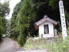 (場所) 熊本県上益城郡矢部町上畑の小高い丘の上にあります。上畑というのは矢部町中心街から東がわの地区名です。国道道218号線の上に車道橋がありますので、その近くの坂から登ることになります。写真のような白いお堂の中に安置されています。撮影は平成13年8月28日になりますが、久木野村の放牛地蔵(第35体)をさがしての帰り道です。
