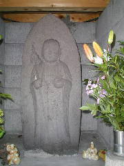 (石仏) 地蔵菩薩の立像です。右手には錫杖を持ち、左手には宝珠を持っています。錫杖も宝珠もりっぱな物で、全く傷んでいません。風雨にさらされなかったのでしょう。また顔などの彫りが深く、すばらしい仏像になっています。