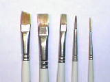 ペイント用の筆です。500円から2000円します。私が最も愛用しているのは、一番左の筆です。高価なので、大切に扱っています。最初の頃、筆を洗わずにそのまましていたため、かなり傷んで使えなくなったことがありました。筆洗いに入れたままもよくありません。塗ったあとは必ず水で洗い、作品完成後は液体石鹸で洗っています。筆の根元まで絵の具をつけるのが一番いけません。 |