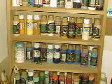 いつのまにか絵の具も増えました。茶系が一番多く、17本です。赤系が11本、青系が12本、緑系が10本です。他には黒・灰・白・金・銀が各1本ずつ購入しています。単価は300円くらいでしょうか。結構長持ちしますが、使うときはよく振ってからでないと溶液が分離しています。水性ですから水に溶けます。しかし乾燥したら、水に強く溶けません。 |