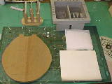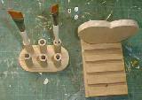 自作の道具です。左は筆立てです。余り板と、穴あきの棒を使って作りました。右はニス塗り用の台です。乾燥させるときなど便利です。ストーブの前に置いて乾燥させることもあります。板と板の幅は、15mmです。必要は発明の元。すっぱいは梅干しの元。 |