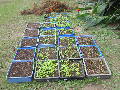 9月中旬にまいたキンセンカの種が、移植したビニポットの中で大きく育ちました。40ケースほどあるでしょうか。花壇では初夏に定植したセンニチコウとヒャクニチソウが、終わりを告げました。この記録は、平成15年11月に行った花壇の作業です。もちろん私だけでなく、生徒や先生方も手伝ってくれました。1は移植前の育苗箱です。これをビニポットに移します。