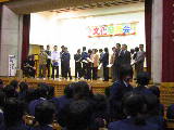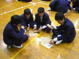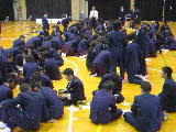 19日(金) トラックにトールペイント、ピーナツ人形、そしてミカンを載せて出勤する。9時、いよいよ体育館で文化発表会の始まり。内容も盛りだくさんで、英語暗誦・意見発表・ギター演奏・総合学習の成果発表と続いた。午前の部の締めくくりは、職員合唱であった。仮装した先生もいて、生徒も盛り上がった。11時40分から、私が期待する展示見学である。一旦椅子を持って生徒が退場したので、急いで手作りパズルを体育館フロアに並べた。生徒が集まってくれるかなと不安があったが、15分もしたら150人ほどが体育館に集まり、大入り満員の賑わいとなった。時間をかけ苦労して作ったパズルが役に立ち、大いに満足であった。しかし、生徒が答えを聞いても、私には解けないのである。