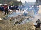 25日(金) 朝一番の仕事は、就学援助の書類決済である。けっこう時間がかかった。10時になったので、山北小学校へ行く。今日は児童が作成した粘土の仮面を、野焼きするという。縄文時代の方法に近い、素焼きの方法である。到着したら、準備が整っていた。30個近いお面がブロックに並べられ、少しずつオキ(燃えカス)が横から近づけられた。粘土の温度が十分上がったところで、竹炭を載せるということだった。時間もないので、12時には学校へ戻った。直ちに給食。