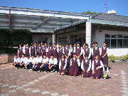 積極的に活動している本校の生徒会が、平成15年9月27日(土)に校区の施設を訪問しました。生徒会執行部と合唱部、そして先生方も含めて、総勢40人の訪問団となりました。訪問先は、花園7丁目の老人ホーム、「明生園」です。入所者104名のホームですが、約50人の方が談話室に集合して私たちを迎えてくれました。