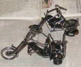 ブリキや廃品で作ったバイクの置物です。水前寺公園の入り口近くのお店で見つけました。千円ですが、それ以上の価値を覚えます。現在三台集めました。このバイクを考案した方に会いたいものです。 |