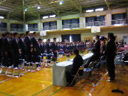 | 3月10日の卒業式は厳粛な中に進められ、三年生の卒業を全員で祝うことができました。保護者手づくりのコサージュを胸につけ、130名は感動したことと思います。式辞の中で述べましたが、一番荒れていた時期に入学した生徒です。生徒が三年間頑張り続けたことを、しっかりほめたつもりです。式の途中はもちろんのこと、閉式後も何の問題もなく終了したことをご報告いたします。また、今年から開式を九時半に早めましたが、会場の後片付けの都合です。 | ![]() |