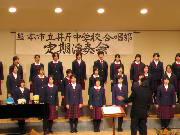 | 本校の最後の締めくくりは、合唱部の定期演奏会になりました。3月21日(火)の午後2時から、子ども文化会館4階・くじらホールで開演です。田尻先生の気持ちを表して、テーマは「新たなる出発」。三年生はもちろん、卒業生も参加してくれました。私の好きな「ラファ・ラファ」をはじめ、演奏曲は全部で18曲です。満員の聴衆を魅了する歌声に、私たちも感動しました。ちなみに吹奏楽部の演奏会は多いのですが、合唱部の演奏会は珍しいとのこと。 | ![]() |