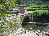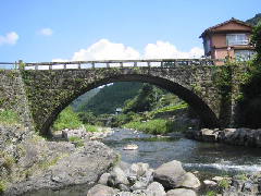 この橋の架橋年代は、昭和30年(1955)になります。まだ新しい橋ですが、苔むして古い感じがします。周辺は公園化され、川へ下りることができるように、遊歩道が造られています。親柱・欄干・輪石・壁石と形がよく、引き締まった感じがします。道路部分は舗装されていますが、大切に残したい橋です。橋の長さ20m、橋の幅4mです。この写真は、河原に下りて撮影しました。このまま絵になると思いませんか。