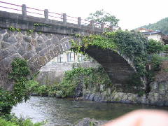 長さ36.4m、幅4m、高さ10m、文政年間では熊本最大の石造眼鏡橋で、当時この技術を持つ者は八代郡種山村の三五郎一族だけとされていたが、この橋の石工は西迫間村の伊助であった。この橋のアーチは扁平で拱環(こうかん・半円部の輪石)も種山式に比べ薄く独得のものであるが、激しい諸車の通行にもかかわらずよく百六十年の風雪に耐え、川面に写る景観は諸人の眼を楽しませている。なお、碑文「迫間橋」は、隈府町の学者 城野静軒の筆である。 |