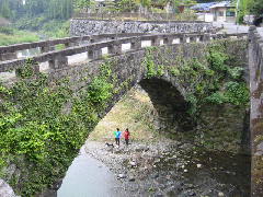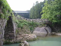 | 二俣橋 釈迦院川と津留川の合流点に連なって架るこの橋は文政●●年(182●)種山村の石工嘉八によって架けられたものである。嘉八は矢部町の通潤橋の架橋で知られる丈八(橋本勘五郎)の父で、現在の八代郡東陽村の人である。この二橋は、矢部・砥用方面と松橋方面及び甲佐方面を結ぶ重要道路が交差する要所であり景観も良く往来する人々の良き休憩所なっていた。この二橋の特徴は二つの川に直角に架けられて連なっていることと下記の様に長さ・幅・高さが殆んど同じということであり別名「双子橋」とも呼ばれている。 第一橋 長さ28m・幅3.3m・高さ8m 第二橋 長さ27m・幅2.5m・高さ8m |