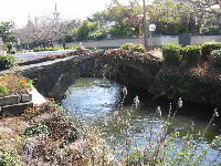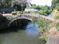 壁石は少なく、頂上部は輪石だけといった小さな石橋です。県道と平行して流れる馬場楠井出に架けられたもので、長さ10.8mです。欄干は角柱の石が並べられただけで、通路部分は砂利道になっています。輪石は石の楔で連結されていますが、この技法は御船町・門前川眼鏡橋や植木町・豊岡眼鏡橋と同じ方法です。昭和55年2月26日に、菊陽町指定文化財になっています。