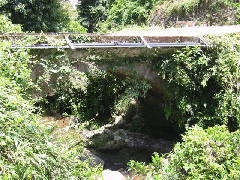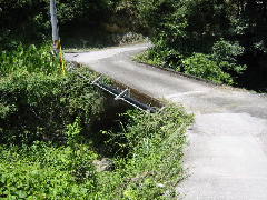 県道で車を降りて左方向へ歩きますと、やがて今屋敷橋が見えてきます。周囲は畑と雑木林です。この橋は館原橋と同じく嘉永元年(1848)に、種山組によって架けられたものです。橋の長さ7.37m、幅2.48m、径間6.3m、拱矢3.44mとなっています。橋の上は、コンクリートで固めてあります。トラックも通る農道として、今も使用されています。