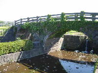| 津久礼眼鏡橋(津久礼宮ノ下 菊陽町指定文化財) この眼鏡橋は、津久礼井出(大アーチ)と、瀬田下井出(小アーチ)下流に架かる二連式石造アーチ橋です。この橋の特徴は、津久礼井出の川底は低く、瀬田井出は高く、周辺の実情に合わせて構築されていることです。津久礼村(区)は、もと白川端にあったものを、延宝時代の始頃(1677)当時の藩主細川綱利公の命により、現在地に移住し、元禄12年(1699、御普請方、野口小次右衛門)津久礼井出が完成すると、これまでの畑地が水田となり、経済性の向上と共に、この眼鏡橋が架けられたものと思われます。 この橋は、天保9年(1838、戸次村住 石工治助)に作られましたが、その当時は、阿蘇以西の村々と、熊本国府を結ぶ最も重要な道筋(窪田往還)にあたり、また、地元民にとっては日常欠くことのできない生活道でもあったのです。このたび、県営圃場整備事業を推進するにあたり、祖先の貴重な遺産を保存するため、周辺用地も併せて整備し、公園化するものです。 菊陽町教育委員会 |