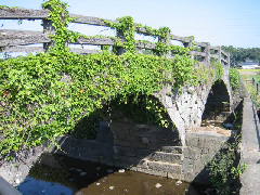 場所 上津久礼眼鏡橋(かみつくれめがねばし)の所在地は、菊池郡菊陽町津久礼字松ノ本です。熊本市からは国道57号線(東バイパス)を北上して、県民総合運動公園の入口へ行きます。ホテル「火の国ハイツ」の先に大きな歩道橋がありますので、そこから右折します。この道路は県道145号線で、3kmほど直進すると、T字型交差点近くにやって来ます。ここに井口眼鏡橋がありますが、この交差点で左折します。さらに300mほど先の白川に架かる津白橋を通過すると、右方向にこの眼鏡橋が見えます。田んぼの中です。
