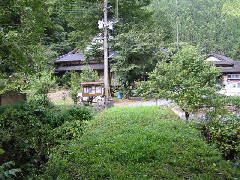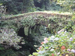 | 高原橋 高原橋は「こうらばし」と呼ばれ、旧栗木村のほぼ中央に位置する栗木川に架けられた眼鏡橋で、泉村には石橋が13基ある中で5番目に古い橋となっています。栗木地区のこの橋より上流では、木材を始め林産物の生産が盛んだったため、当時は人馬の通行や日常の生活道として大変重要な橋でした。大正年間現在の県道の整備により使用されなくなりましたが、たび重なる大水にもまけず、当時の姿を保っています。 全長15.0m、径間11.9m、拱矢4.0mと橋の規模はそれほど大きくありませんが、歩行部の中央が盛上がり、アーチ型をなしており、高欄(手摺り)も付けてないなどの特徴があります。 |