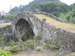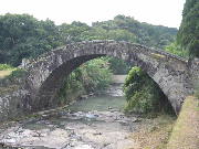 | 本渡市指定文化財 「楠浦の眼鏡橋」 昭和33年5月1日指定 この眼鏡橋は、楠浦〜宮地往還を結ぶために方原川に架けられたもので、釜の迫の堀切りと共に、楠浦村庄屋宗像堅個氏の遺徳を後世に伝える二大事業の一つである。アーチ型の石橋は優美にして且つ堅牢、橋長26.33m、橋巾3.05m、明治11年6月11日から80日間で完成している。石材は下浦石で、石工も下浦の松次、打田の紋次、足場枠組大工は楠浦の和田茂七である。 宗像庄屋はこの架橋工事の25年前に前潟新田の水害を救うため、方原川の下流を変える釜の迫の堀切りの大工事をなし遂げている。即ち万延元年(1860)から元治元年(1864)まで実に5年余りの歳月と延4万5千余人を使った大工事であった。削河碑は、方原川が「なきごしの海」に曲がる河畔に建てられている。 本渡市教育委員会 |