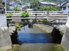 この橋がいつ架けられたのかなど、詳しいことはわかりません。幅5〜6mの川をまたぐこの石橋は、現在も現役の橋として活躍しています。周辺は白壁の建物が並び、なつかしい雰囲気を漂わせています。この川は春の川といい、八代海(不知火海)に注ぎます。旧暦8月1日の八朔の日には、海上の不知火を一目見ようと観光客でにぎわいます。