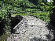 細い路地の奥にありました。この石橋は大正4年(1915)に、川野賢蔵によって架けられたものです。橋の長さ8.5m、幅1.8m、径間7.4m、拱矢2.5mとなっています。この石橋は現在も使用されていますが、車が通れるわけではありません。地域の農道といった感じです。手すりも欄干もありませんが、すっきりとした曲線が印象的でした。東陽村指定文化財です。