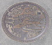 松山橋を見学しての帰り、路上のマンホールが目にとまりました。マンホールの蓋のデザインは市町村によって異なりますが、東陽村のものはなかなか凝っています。上に桜、左右に松、中央に石橋が描かれています。